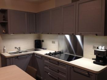 Cuisine réalisée en placage chêne. Un agencement sur mesure qui consiste à positionner deux L face à face afin de gagner de l’espace et des plans de travail.