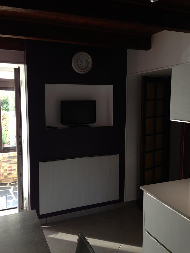 Le quartz permet de retrouver une cuve d’évier insérée sous le plan et un égouttoir rainuré dans la masse pour une facilité d’entretien. Un encadrement et un rangement spécifique à été réalisé pour le coin TV. Une ambiance Chaleureuse et raffinée !
